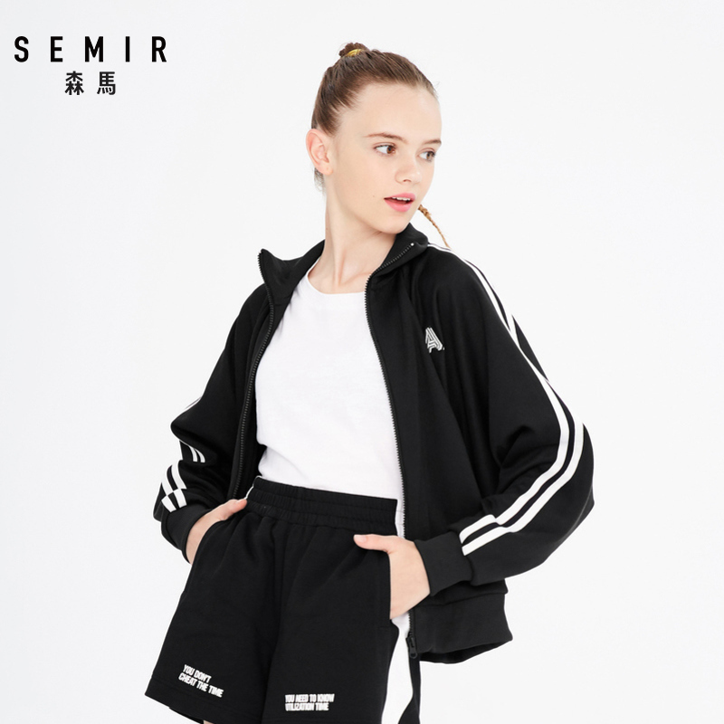 森马夹克女2019秋季新款黑色撞色条纹贴布绣运动装外套宽松立领潮