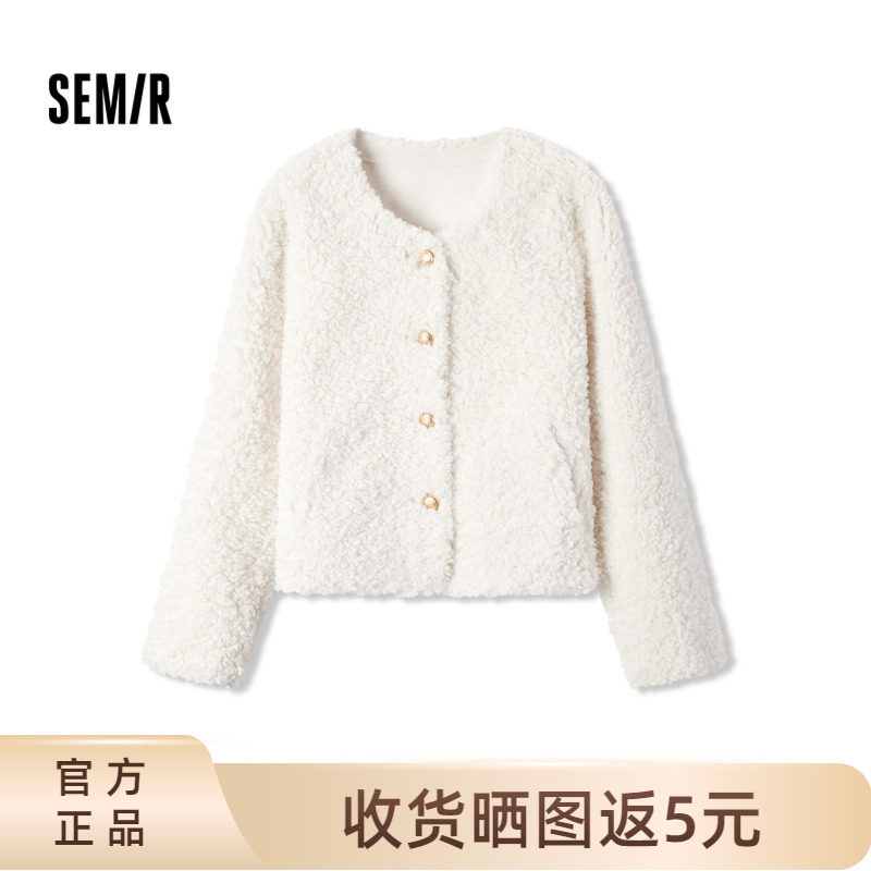[商场同款]森马外套女短款圆领修身2024冬新款仿羊羔毛夹克小香风