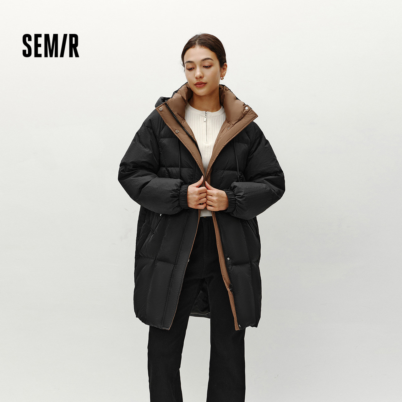 森马羽绒服女冬长款插肩袖撞色宽松连帽80绒子休闲简约百搭厚外套