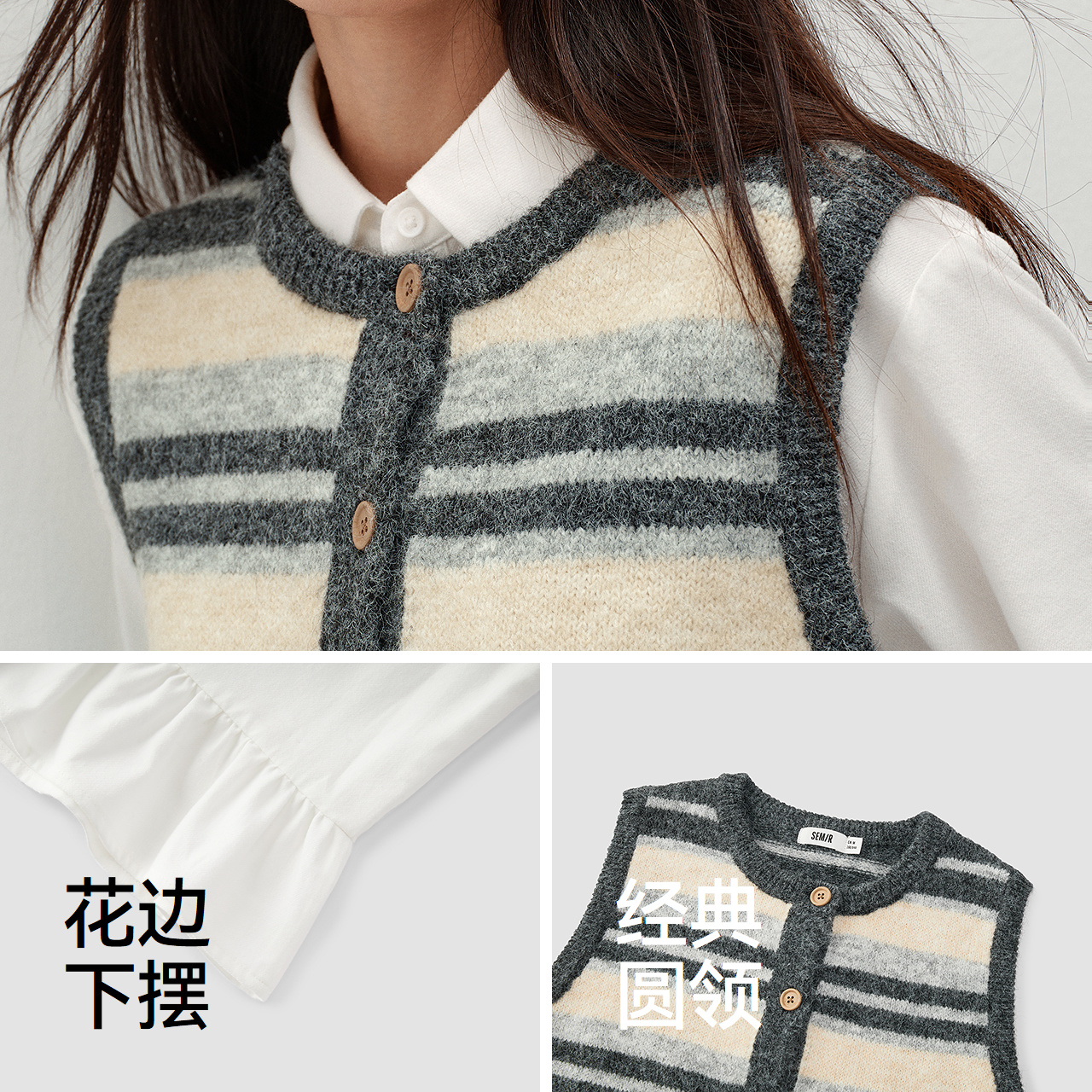 商场同款|森马长袖衬衫女冬季条纹短背心花边衬衣2025新款两件套