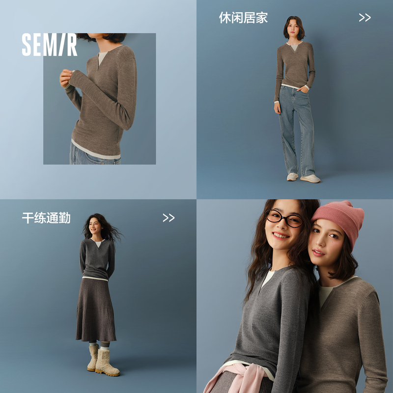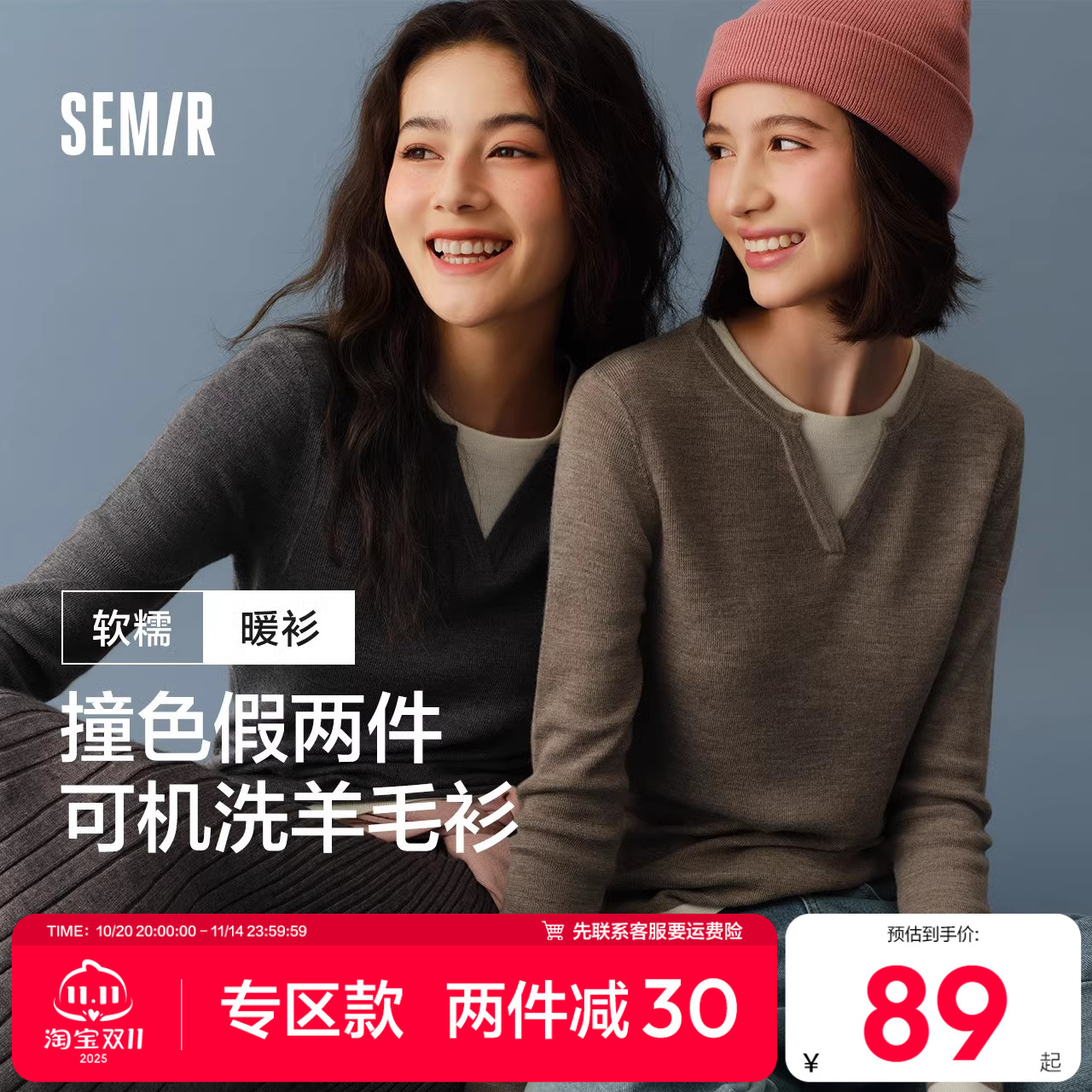 森马针织衫女羊毛圆领修身内搭2025冬季新款假两件拼接毛衫时尚薄